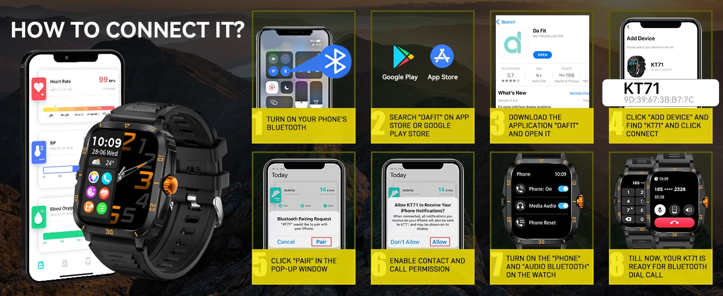 Rugged, feature-packed and ready for real life, the EIGIIS KT71 smart watch blends military-inspired durability with health-tracking on a vivid 1.96" IPS display.