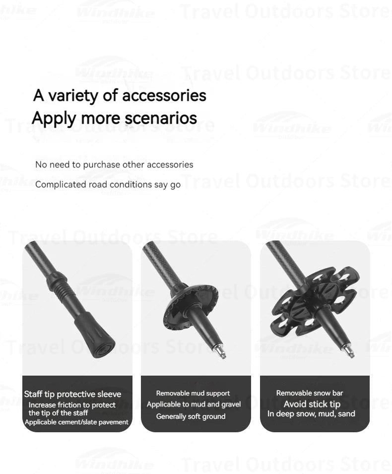 - Tungsten-steel tip with a protective PP seat, plus mud support and snow rail for grip on mud, snow, or rocky paths.