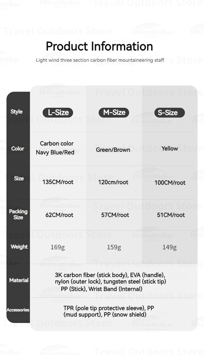 - Three-section 3K carbon fiber shaft with EVA straight grip and nylon outer lock; choose 100 cm, 120 cm, or 135 cm, with compact storage of 51 cm, 57 cm, or 62 cm; weight ranges from 149 g to 169 g.