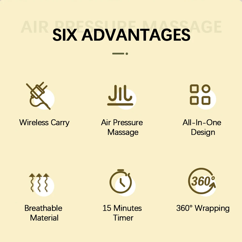 1. Wireless leg massager that uses airbags to create a rhythmic compression experience, offering a deep and soothing massage from the bottom up. It helps stimulate blood circulation, relax tired muscles, and re-energize your legs!